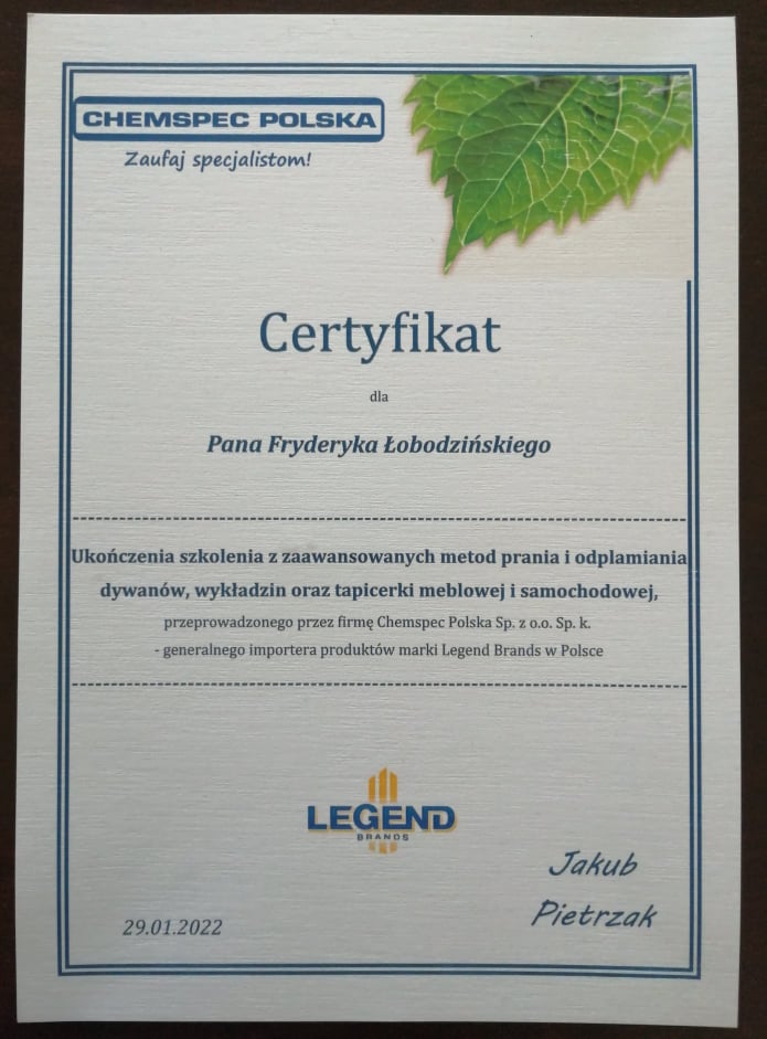 Dzięki szkoleniom i poznawaniu nowych rozwiązań w technikach prania, z roku na rok podnosimy swoje kwalifikacje i jakość usług.